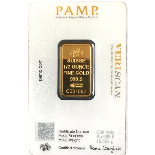 Buy 0.5 Ounce PAMP Suisse gold bar with 999.9 purity. Gold bar packed in a sealed packet with certified and VeriScan security seal.