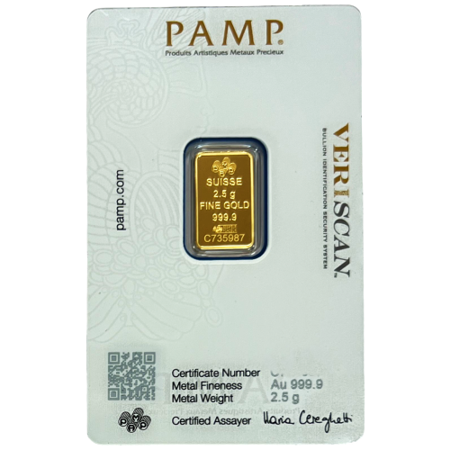 Buy 2.5 Gm PAMP Suisse Gold bar 999.9 Purity. 2.5 gm gold bar packed in a sealed packet with certified and VeriScan security seal.