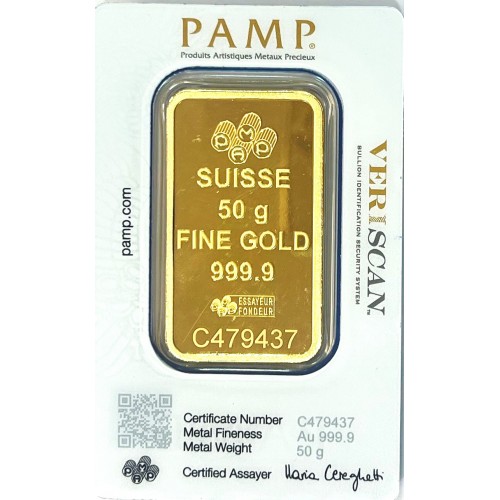 Buy 50 Gm PAMP Suisse Gold bar 999.9 Purity. 50 Gm Gold bar packed in a sealed packet with certified and VeriScan security seal.